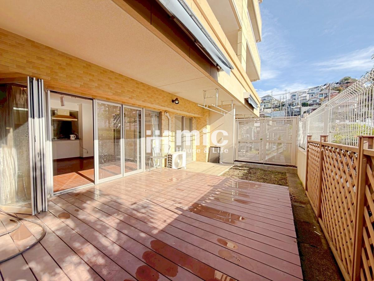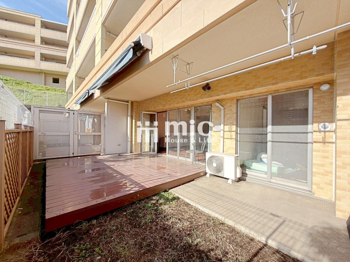 【ペット飼育可】リビングから外に続く、約10帖のウッドデッキ!無償で使える使用権付駐車場!